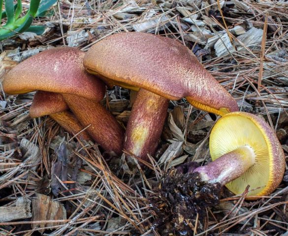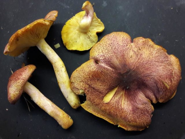 Las pequeñas escamas se encuentran en la superficie, generalmente son de color rojo pardusco o violeta. Con muescas, con picos en los bordes, las placas están firmemente adheridas a la tapa. Su color principal es el amarillo. Las esporas son de color blanco.