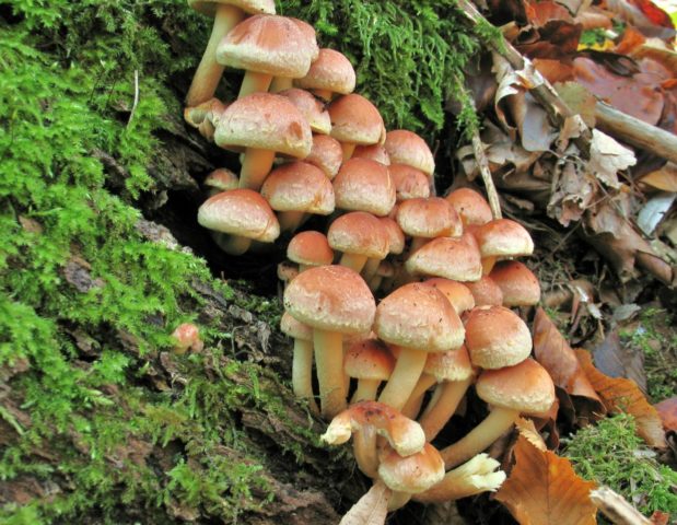 - Hongo falso... Crece en grandes grupos junto a árboles caídos y tocones. Su pata es alargada, alcanzando los 12 cm, de diámetro - 2,5 cm. El casquete es convexo, en la parte central es de un color más oscuro. Sobre todo, la variedad de espuma falsa de color rojo ladrillo parece una fila. Su color es marrón rojizo, a veces con un tinte amarillo. Este hongo causa intoxicación cuando se ingiere.