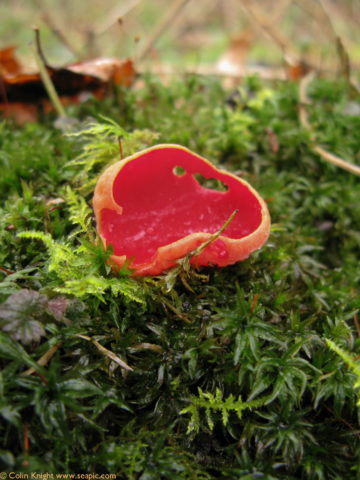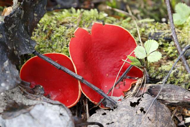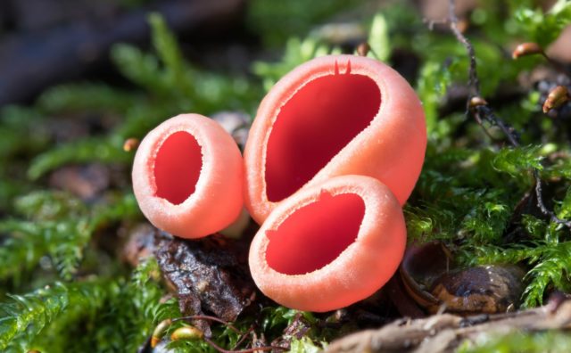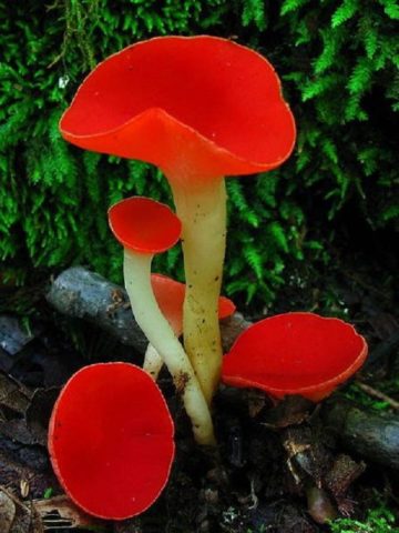 - Sarkoscif escarlata. Se puede distinguir por la forma de las vellosidades en el exterior del cuerpo fructífero, son más pequeñas, sin curvas. Los hongos no difieren en sabor, ambos tipos son comestibles. La formación de sus cuerpos fructíferos es simultánea: en primavera y otoño. El gemelo es termófilo, por lo que se encuentra en las regiones del sur.
