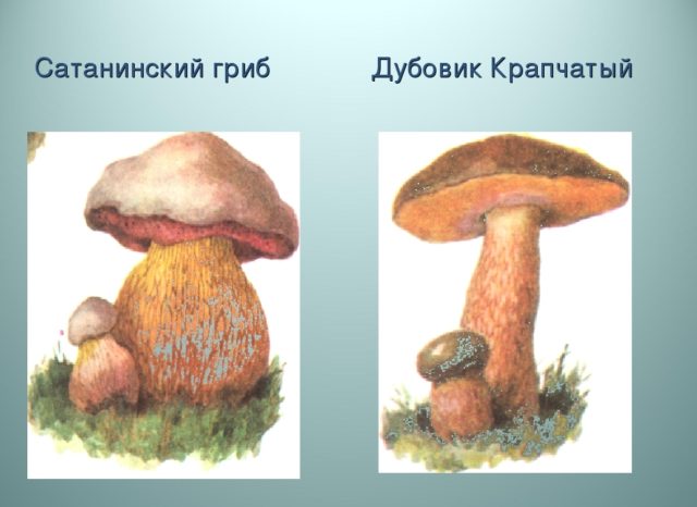 En apariencia, el roble (poddubnik) y el hongo satánico son muy similares. No es fácil distinguirlos, ni siquiera por signos indirectos: ambos se vuelven azules al presionarlos. Maduran en el mismo período de tiempo, por lo que es bastante fácil confundir los dos. Sin embargo, todavía existen diferencias entre ellos.