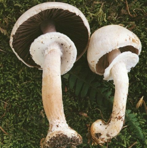 Un sombrero con un diámetro de 10 cm a una edad temprana se asemeja a una campana sin brillo; con el tiempo, la superficie se endereza y se vuelve plana y redondeada. Está cubierto con una piel aterciopelada de color blanco grisáceo que se puede quitar fácilmente durante la limpieza. La capa inferior está formada por delgadas placas oscuras cubiertas con una película densa. A medida que crece, se abre paso y desciende sobre la pierna en forma de falda. La reproducción se produce por esporas alargadas, que se encuentran en un polvo marrón oscuro.