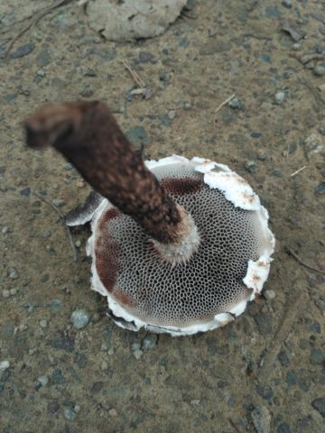 - Los cuerpos frutales son grandes; en algunos individuos, las tapas crecen hasta 13-15 cm de diámetro. La superficie es blanca con sellos convexos en forma de escamas de color marrón o gris oscuro de varias formas y tamaños. Los bordes son desiguales con fragmentos rotos.