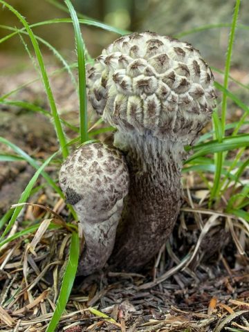 La apariencia es tan poco atractiva que pasan recolectores de hongos sin experiencia, confundiendo los cuerpos frutales con venenosos. El hongo de piña (en la foto) está completamente cubierto de escamas grises o marrón oscuro. El color se oscurece con el tiempo, el recubrimiento se forma en forma de sellos convexos separadores. Los especímenes jóvenes se asemejan exteriormente a un árbol conífero conífero, y la cubierta erizada de la pata es copos grises, de ahí el nombre del cono de pata de algodón.