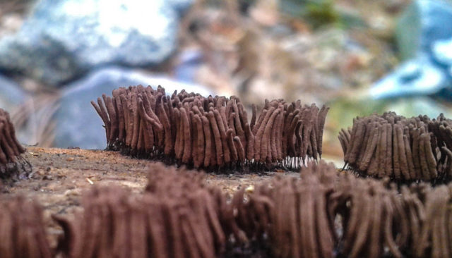 La estemonitis axial se asienta sobre madera muerta en grupos separados pero muy unidos