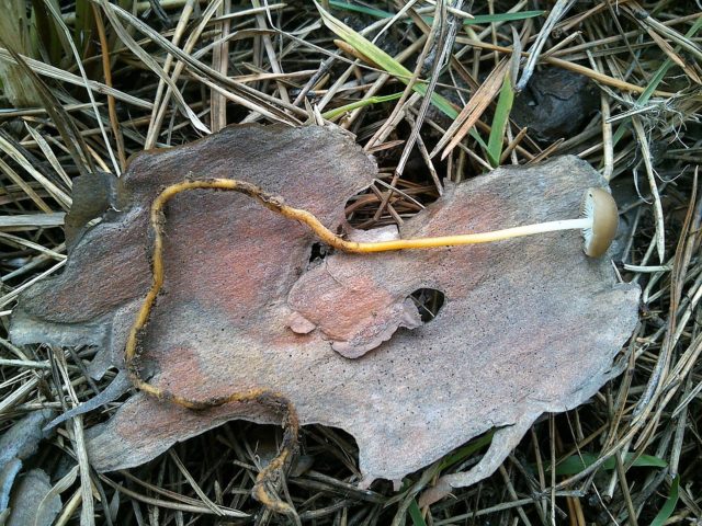 Una pierna delgada pero larga está unida a la gorra. Su longitud puede ser de 10 cm o más. La pata está sumergida en el sustrato de abeto, y si extrae el hongo por la raíz, al final puede encontrar una picea o piña podrida.
