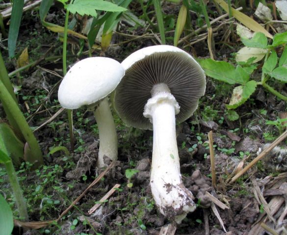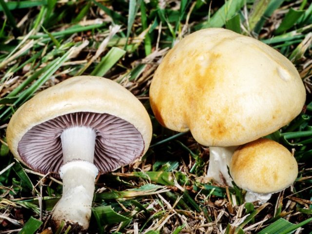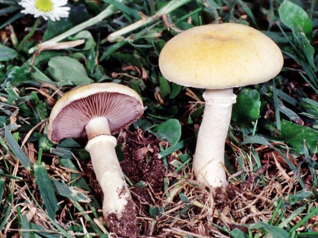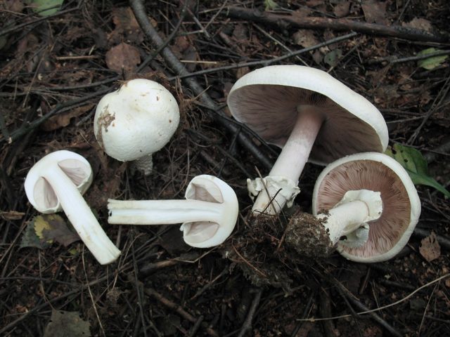 - Champiñón, grueso o fino - Hongo comestible no venenoso. Una diferencia característica es que el champiñón tiene una forma y un color diferentes de las placas, un anillo más grande, un color cremoso de las esporas;