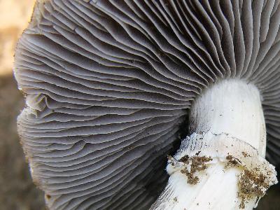 Las placas se ubican moderadamente a menudo, intermitentes, adheridas al pedículo por un diente. Al comienzo del crecimiento, son grisáceos, con la maduración de las esporas adquieren un color rico de gris grisáceo a negro violeta.