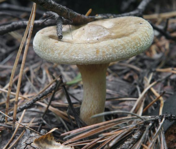 La pierna de un cerdo grueso alcanza los 10 cm de altura y 5 cm de ancho, tiene una carne densa, cubierta con una flor de fieltro. Crece, desplazándose hacia el borde de la gorra, a veces se curva.