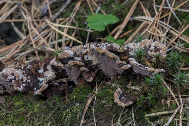 Las setas son sésiles o con un tallo pequeño. La superficie es irregular, lanosa, lisa por debajo. La coloración se distribuye de manera desigual, desde el marrón oscuro al marrón o marrón rojizo. Los bordes son más claros, de color marrón, fieltro.