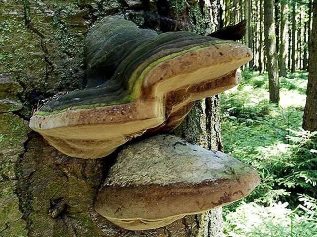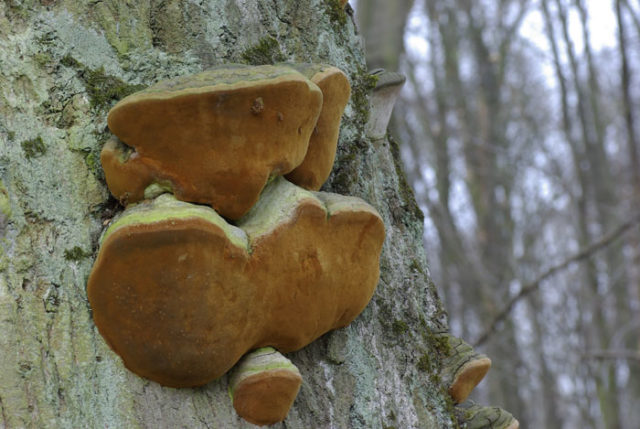 Los cuerpos frutales del hongo yesca de Gartig aparecen en la parte inferior del tronco en el lado norte.