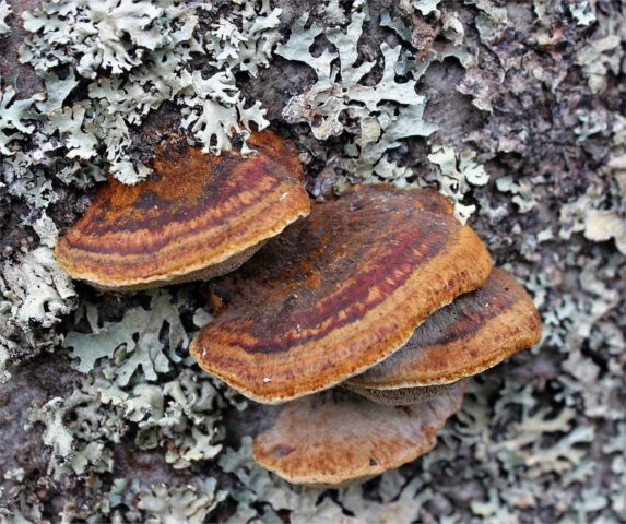 El cuerpo frutal de esta especie es semisedentario, adherente al costado, formado por un solo sombrero. Como regla general, la tapa es de forma redonda o semicircular con una sección transversal triangular, pero en los troncos caídos puede estar abierta. A una edad temprana, los bordes se redondean, volviéndose gradualmente curvados, puntiagudos o sinuosos. El tamaño máximo del sombrero es de 8 cm de diámetro y el grosor no supera los 3 cm.