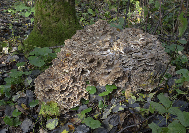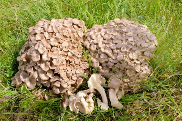 - Frondoso - representante comestible, raro. Crece en bosques caducifolios, sobre sustrato leñoso en descomposición. Debido a una disminución de la población, la especie figura en el Libro Rojo, por lo tanto, si se encuentra un hallazgo, es mejor pasar y dejar que la especie se multiplique. Se puede reconocer por un gran arbusto, en el que hay hongos fusionados con una densa capa en forma de hoja y una pierna delgada y carnosa. La pulpa de color amarillo blanquecino tiene un sabor y un olor agudos a nuez.