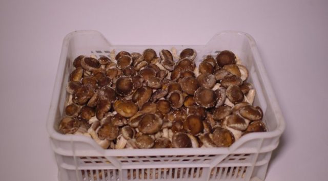 Los hongos shiitake se cosechan cuando alcanzan la etapa de madurez técnica. En este momento, los sombreros aún no habían tomado una forma plana. 5-6 horas antes de la recolección planificada de hongos, la humedad del aire se reduce al 55-60%. De lo contrario, los cuerpos fructíferos serán acuosos y pueden aparecer manchas marrones bacterianas en la parte inferior de la tapa. Una disminución de la humedad ayuda a secar la piel superior del sombrero, lo que hace que los hongos sean más transportables y resistentes a los daños mecánicos.