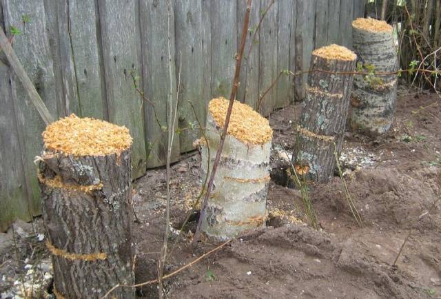 - Debe cavar agujeros en el suelo, cuyo ancho es igual al diámetro de los troncos y la profundidad es de aproximadamente 30 cm. El número de agujeros corresponde al número de troncos o tocones.