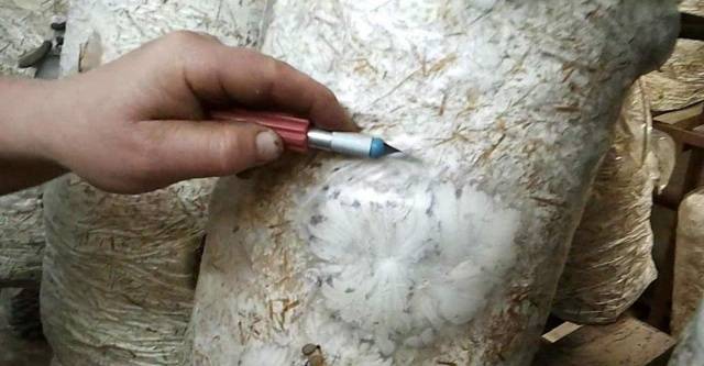 Cuando las bolsas están llenas de sustrato, se atan. Por un lado, cada bolsa se presiona ligeramente hacia abajo y se hacen agujeros en la parte opuesta. Los agujeros se cortan con un cuchillo estéril y afilado, cada uno de unos 5 cm de largo, se hacen en un ángulo de 45 grados.