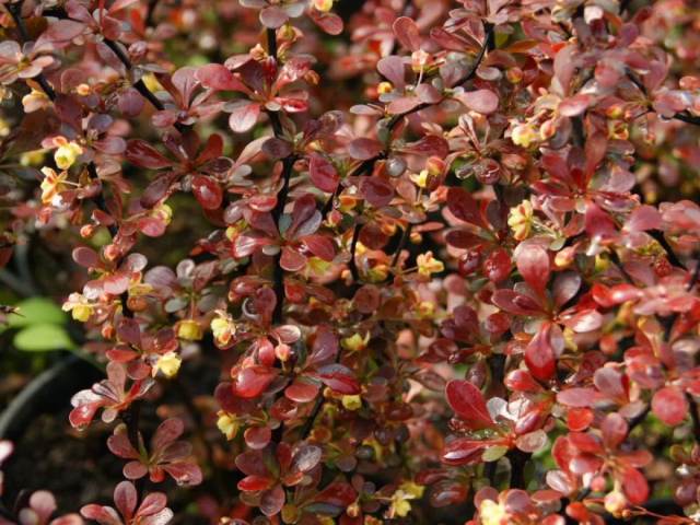- Semillas La opción que consume más tiempo. Primero, se cosechan las semillas de la variedad Darts Red Lady, madurando en el fruto. De estos, solo del 15 al 40% tienen germinación. La cáscara se corta en las semillas y se planta en el suelo en el otoño. Los brotes aparecen en la primavera. Después de 2 años, las plántulas de Thunberg se pueden trasplantar al lugar deseado.