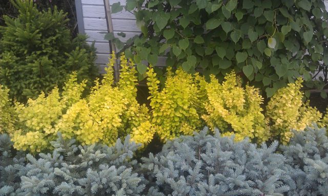 Las coníferas de hoja perenne son un gran telón de fondo para el Thunberg Golden Rocket. Los verdes esmeralda realzan eficazmente las hojas amarillas del agracejo. La planta también se ve única en otoño, cuando maduran ricas bayas rojas.