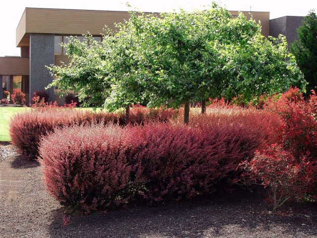 Un solo agracejo alto en diseño de paisaje, como en la foto, se ve impresionante contra el fondo de vegetación cubierta de hierba, en un lecho de grava o rodeado de flores bajas.