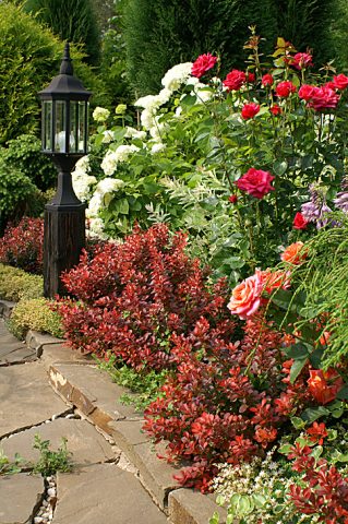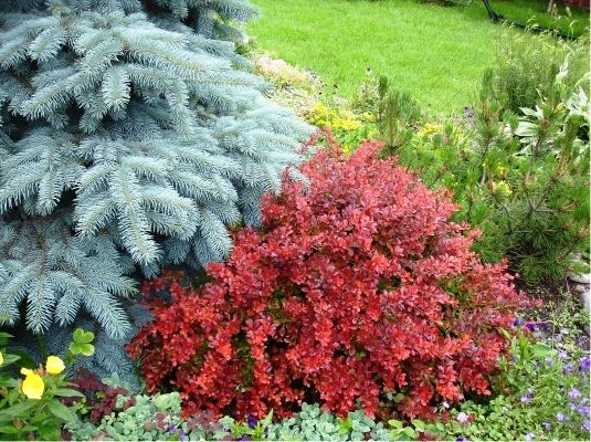 - en contraste, enmarcan céspedes con agracejo con hojas rojizas;