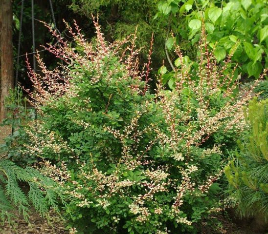 Atractivo para un elemento notable del diseño del paisaje con una copa alta con follaje verdoso y violeta oscuro, que crece hasta 2 m, se extiende al mismo diámetro en 10 años. Los brotes son arqueados, con espinas de hasta 2-2,5 cm, las flores son de color amarillo anaranjado, tienen un olor agradable y se recogen en pinceles colgantes. La planta tolera bien la poda, mantiene su forma durante mucho tiempo. Podado 2 veces por temporada. El color magenta de las hojas sombreadas puede convertirse en un verde oscuro normal.