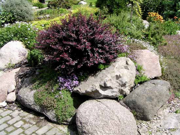 En los jardines rocosos, las variedades también se plantan con una corona baja en forma de almohada o redondeada, así como para el diseño del paisaje en un estilo oriental. El arbusto se elige en proporción al tamaño de las formas circundantes.