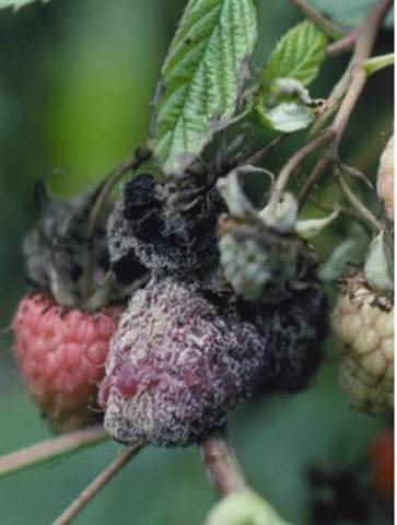 La enfermedad más común. Aparecen pequeñas manchas grises en los frutos, que crecen y afectan a toda la baya. Comienza a pudrirse, se cubre con una flor gris, que contiene las esporas del hongo. Las esporas se propagan con la humedad y el aire y pueden infectar todo el árbol de frambuesa. Se observa un brote de la enfermedad durante un período de días bastante frescos con alta humedad.