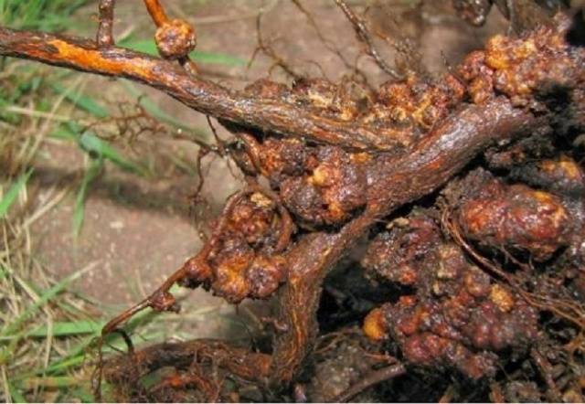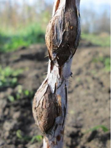 El principal signo de infección es la aparición de pequeños tumores (focas demasiado grandes) en las raíces. Gradualmente se fusionan y forman una superficie común grumosa con una corteza rugosa. Si tales tumores afectan los tallos, al crecer juntos, rompen la corteza. Los arbustos afectados por esta enfermedad se debilitan, no toleran las heladas invernales y mueren.