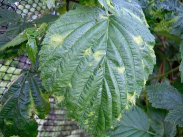 El síntoma principal está en las hojas. En ellos, se notan áreas de forma irregular, que se manchan a fines del verano. Las hojas se vuelven más pequeñas, los brotes se debilitan, su crecimiento se ralentiza. Las bayas se vuelven leñosas, se vuelven inutilizables. Las frambuesas no mueren, pero es completamente imposible curar la enfermedad. Los pulgones son portadores de la enfermedad.