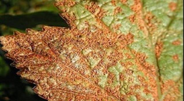 Los síntomas de la enfermedad.: las hojas de grosella con esta enfermedad fúngica están cubiertas con manchas de color marrón rojizo, aparecen crecimientos suaves en forma de pequeñas almohadillas en la parte posterior de la lámina de la hoja, que pueden agrietarse y liberar millones de esporas microscópicas, infectando todas las plantas alrededor.