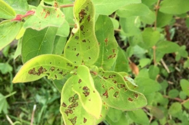 A mediados del verano, el arbusto a menudo se ve afectado por la roya, una enfermedad que provoca manchas de color rojo anaranjado en el follaje. El óxido se propaga especialmente rápido en condiciones de alta humedad. La madreselva cambia de color, los procesos de fotosíntesis en la planta se interrumpen y se produce la caída prematura de las hojas.