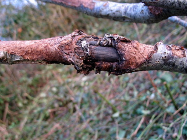 Los síntomas del cáncer común aparecen generalmente en el verano, la enfermedad se propaga con bastante rapidez a las partes vecinas. Para evitar la muerte del arbusto, debe cortar inmediatamente todas las ramas afectadas por el cáncer. Las partes sanas de la planta se tratan con líquido de Burdeos, cortes en el tronco de un árbol. untado con pintura al óleo o rociado con sulfato de cobre.