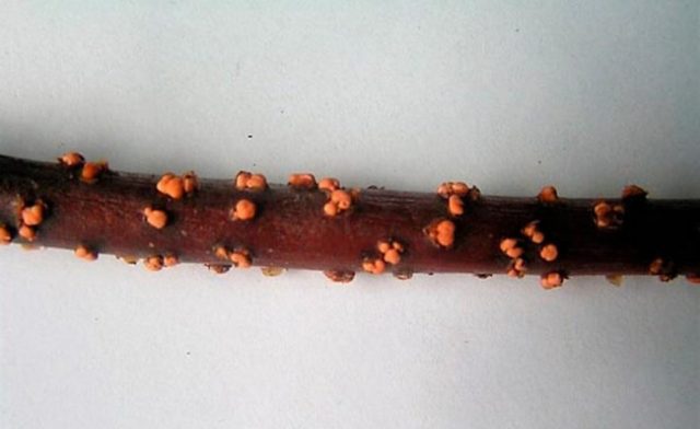 Con la tuberculariosis, aparecen pequeños crecimientos rojizos en los brotes de la planta.