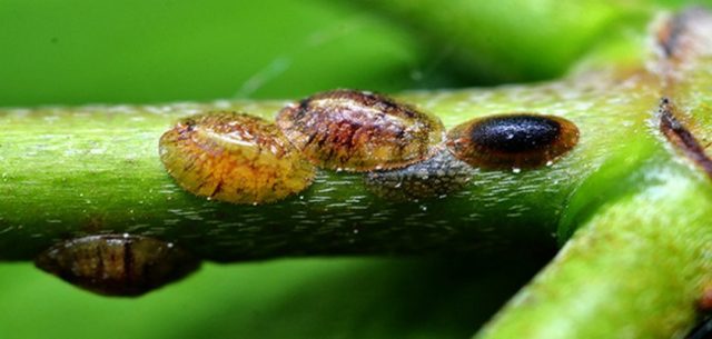 El insecto de escala adulta es un insecto pequeño con un caparazón duro, de ahí el nombre. Las plagas se asientan principalmente en la superficie inferior del follaje y en los lugares donde los esquejes se adhieren a las ramas. Dado que la vaina extrae jugos vitales de las hojas y los brotes, la madreselva bajo su influencia se debilita rápidamente y comienza a perder su masa verde.