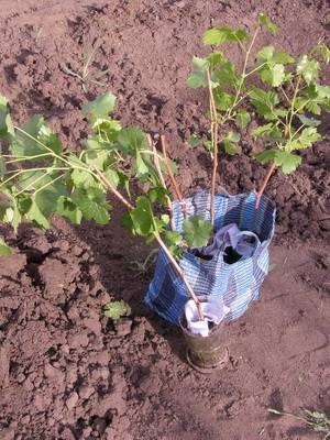 No se necesitan huesos grandes para las grosellas: su sistema de raíces es superficial, una depresión de 40 por 40 cm es suficiente.La capa superior de tierra se mezcla con un cubo de humus, agregando superfosfato - 100-200 gy medio- Tarro de litro de ceniza de madera.Plantan un arbusto, profundizando el cuello de la raíz en unos 10 cm.