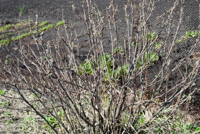 Riega el arbusto con un balde de agua. Los brotes se cortan a una altura de unos 10 cm por encima del suelo, dejando hasta 4 cogollos fuertes en ellos. El área alrededor del arbusto está cubierta con material orgánico.