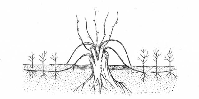 El primer método es el más óptimo. Su esencia es la siguiente. A principios de agosto, se excavan en el arbusto dos ranuras de 15 cm de profundidad, en las que se colocan brotes anuales saludables, se fijan con alambre o una carga y se cubren con tierra.