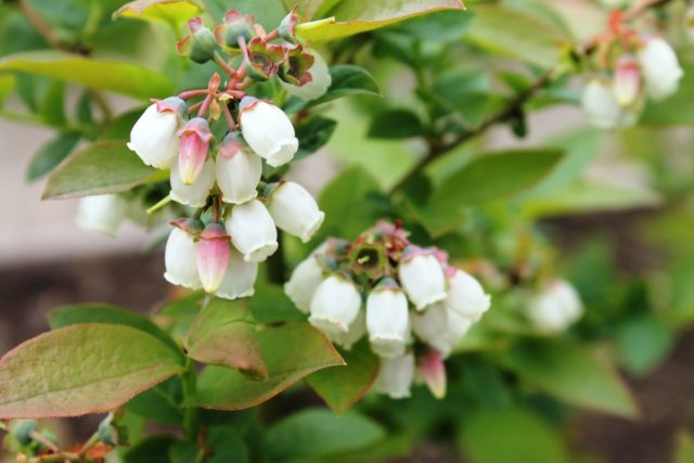 La forma de las hojas se asemeja a una elipse, suave al tacto, los pecíolos son cortos. Es interesante observar la planta cuando comienza a florecer. Los jardineros dicen que durante este período los arándanos de bonificación transforman el sitio.