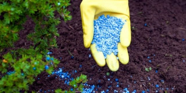 La cantidad total de aderezo que se aplica durante la temporada depende de la edad del arándano. El sulfato de amonio o la urea se utilizan como fertilizantes nitrogenados. Su número es de unos 30 g por un arbusto hasta los dos años. En plantas mayores de 4 años, este número se duplica. Los fertilizantes nitrogenados se aplican en forma diluida a una concentración de no más de 2 g por 1 litro de agua.