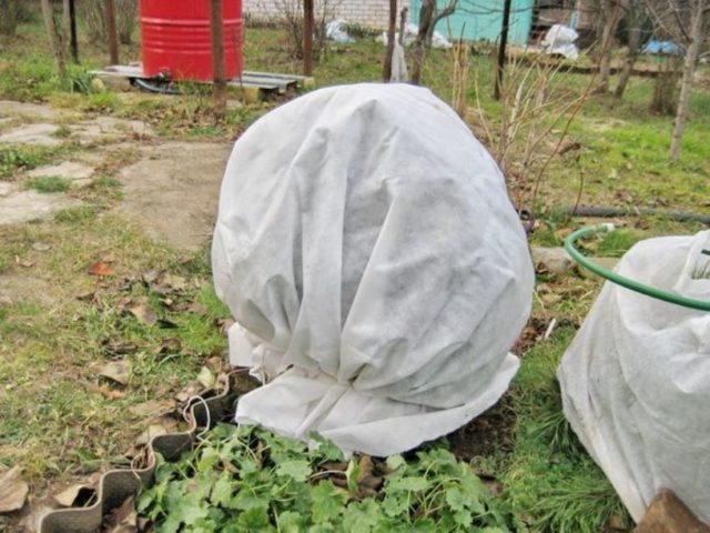 Lo principal al envolver es proporcionar aislamiento térmico para las partes inferior y media del arbusto. Se recomienda envolver todo el arbusto con papel de aluminio o agrofibra y cubrir el fondo de la planta con aserrín o ramas de pino. La altura de dicho refugio es de unos 30-40 cm con respecto al nivel del suelo.
