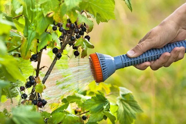 Se usa una regadera regular para regar, con la ayuda de la cual los arbustos de grosella se riegan uniformemente. Tal medida tiene un efecto beneficioso sobre el arbusto, ya que realiza las siguientes funciones.