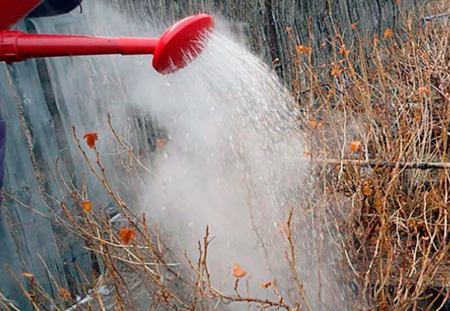 Se recomienda que el primer riego de los arbustos de grosella en primavera se realice antes del comienzo de la temporada de crecimiento, cuando los brotes aún están inactivos. Por lo general, esto es a fines de marzo, momento en el que en la mayoría de las regiones la tierra ya está libre de nieve. El riego se realiza por aspersión, y el agua debe estar caliente, del orden de + 70-75 ° С. Para mejorar el efecto desinfectante, se pueden agregar al agua varios cristales de permanganato de potasio.
