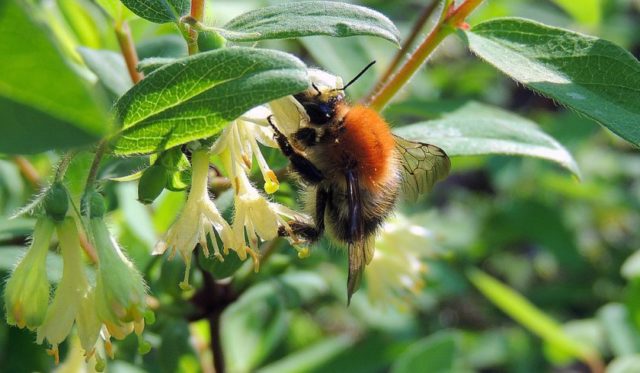 - La madreselva es polinizada por abejas, abejorros y avispas. Sin la participación de insectos, florecerá y dará pocos frutos. Los cogollos se abren muy temprano, porque las primeras bayas aparecen 7-14 días antes que las fresas. Y los insectos en este momento no son muy activos, solo trabajan al sol. Para atraerlos, las flores deben ser de fácil acceso y estar bien iluminadas. De lo contrario, los polinizadores centrarán su atención en los dientes de león u otras plantas.