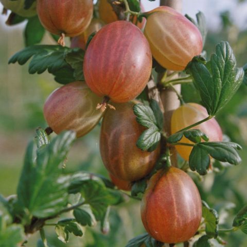 La grosella espinosa Xenia crece hasta un máximo de 1 m de altura, el sistema de raíces mide aproximadamente 30 cm y las ramas están en posición vertical. En el proceso de maduración, aparecen racimos, cubiertos de frutos grandes, cuyo peso puede alcanzar los 14 g. Las bayas tienen un tinte rosa brillante con un tinte brillante, el follaje es verde intenso. El fabricante afirma que el nivel de tachuelas es mínimo. No es necesario que polinices la cultura por tu cuenta, todo sucede de forma natural.