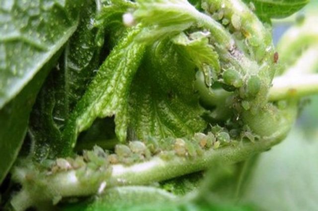 - Pulgón de la grosella espinosa - chupa la savia de la planta, dañando los tallos de las hojas, las placas y las copas de las ramas jóvenes. Las hojas se rizan y se caen, los brotes se doblan y dejan de crecer.