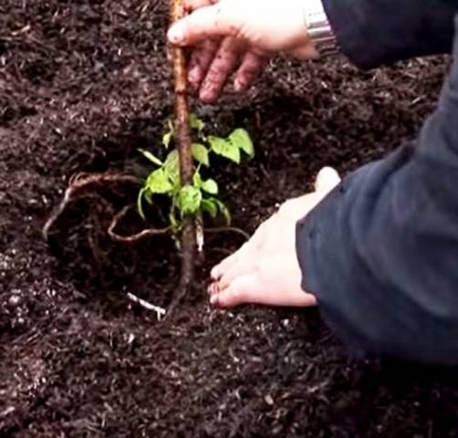 Al plantar plántulas de frambuesa, debe tener cuidado. Los brotes superiores deben estar al mismo nivel que la superficie. Después de plantar frambuesas, se debe pisotear la tierra para exprimir el aire. Luego riegue abundantemente. El suelo se asentará un poco, adhiriéndose firmemente a las raíces de las frambuesas. Las crestas deben cubrirse con mantillo para retener la humedad.