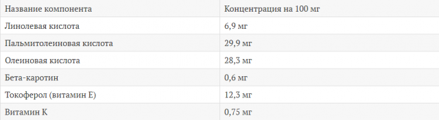 El producto aceitoso contiene vitaminas E y K. De los minerales, hay calcio, hierro, magnesio. El contenido calórico de 100 g de líquido aceitoso es de 896 kcal.