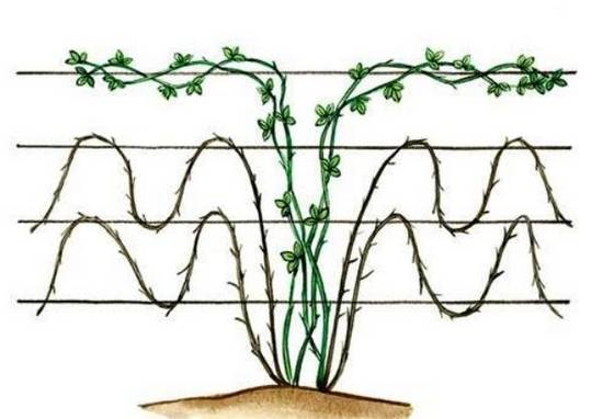 En el esquema de onda, los brotes jóvenes se atan verticalmente al enrejado y corren lateralmente a lo largo del cable superior. Los tallos fructíferos se envían a los lados en ondas a lo largo de los tres cables inferiores del soporte.