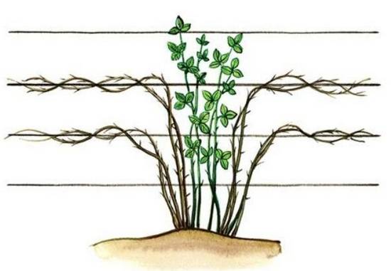 De manera similar, el esquema prevé la distribución de brotes jóvenes de mora en el centro del arbusto, atados verticalmente al enrejado. Se permite que las ramas fructíferas se muevan hacia los lados, pero se tejen en dos. Las trenzas resultantes aumentan la resistencia de la planta atada.