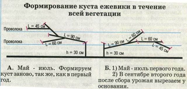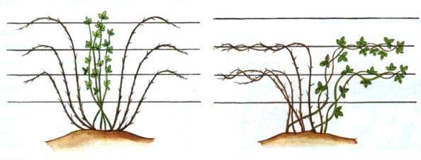 La formación del arbusto en primavera facilita la cosecha de bayas, la poda de otoño y el refugio para el invierno. La vista erguida se despliega sobre el enrejado. Brotes en especies rastreras Mora los jardineros se dividen en brotes jóvenes (brotes de este año) y brotes fructíferos (el año pasado).