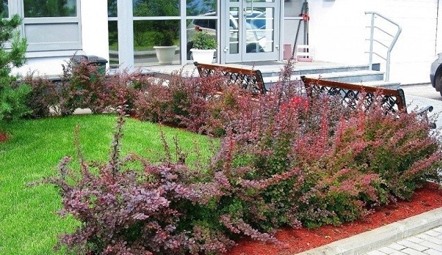 Casi todas las variedades se utilizan en el diseño de paisajes. Barberry Thunberg se ve bien tanto en la plantación individual como en grupo de arbustos. Se planta cerca de bordillos y colinas alpinas. Los arbustos espinosos se utilizan como seto decorativo, que se ve original en el área del jardín. En la foto se puede ver cómo se ve el agracejo Superba en el diseño del área local.